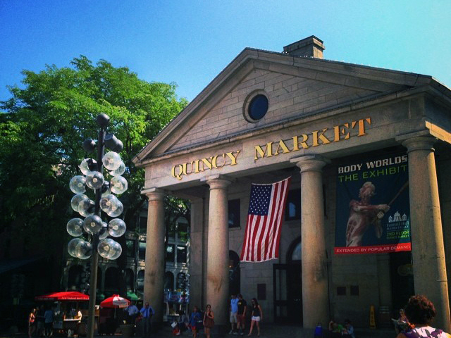 Quincy Market in the Faneuil Hall marketplace of downtown Boston, it is a historic building that still serves as a souvenir marketplace and food court today. The area has expanded to include two other marketplace buildings as well.
